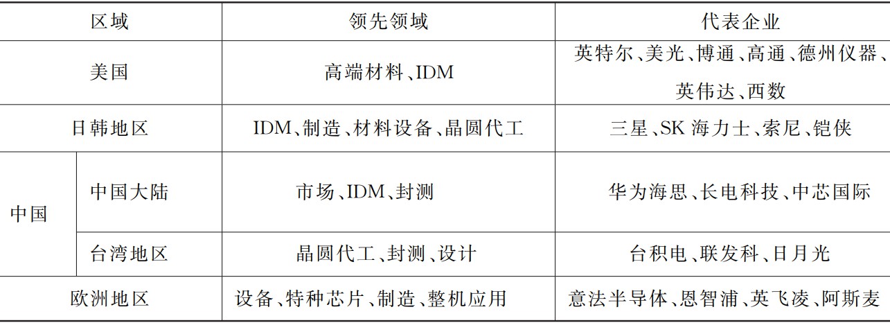 在经济全球化浪潮及产业分工和产业转移的推动下,集成电路产业链已经形成了自己的全球产业分工格局和供应链网络,在分工和合作的过程中,全球化发展的集成电路已经形成了较为明确的分工和竞争优势。经过多年的发展,美国、欧洲、中国和日韩各自锤炼了领先的领域和代表企业。如表1所示,集成电路全球大分工格局表现为美欧在设备、设计和软件领域具有绝对的领先优势,日本主要在材料和设备领域具有领先优势,韩国和中国台湾地区在制造领域具有领先优势,中国大陆则主要在封测和超大规模市场方面具有优势。虽然当前的“逆全球化”趋势对集成电路全球大分工造成了一定的影响,但产业发展的规律决定了一定时期内集成电路产业的全球分工格局不会有太大改变。