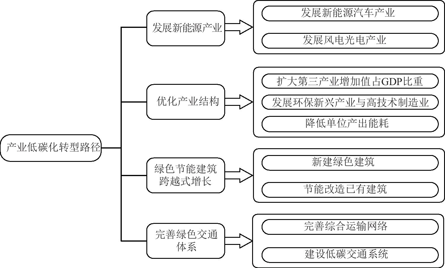 党的十八大以来,中国已在产业低碳化转型方面取得显著成效,形成了产业发展与环境保护协调发展的良好态势。中国的产业低碳化转型主要通过以下几个方面来实现:发展新能源产业、优化产业结构、推动绿色节能建筑跨越式增长及完善绿色交通体系(见图1)。其中,发展新能源产业,主要表现为新能源汽车产业得到快速发展、中国风电和光伏发电设备的产销额均领先全球,技术水平位居世界前列;优化产业结构,主要表现为第三产业增加值占GDP比重增加、节能环保等战略性新兴产业及高技术制造业快速发展、单位工业增加值能源消耗量显著降低;绿色节能建筑跨越式增长,主要表现为城镇新建绿色建筑占当年新建建筑的比例大幅提升、累计建成绿色建筑和节能建筑的面积与节能建筑占城镇民用建筑面积的比例提升,以及对现有居住建筑和公共建筑进行的广泛性节能改造;完善绿色交通体系,主要表现为综合运输网络不断完善、城市低碳交通系统建设加快,以及城市公共交通机动化出行分担率稳步提高。