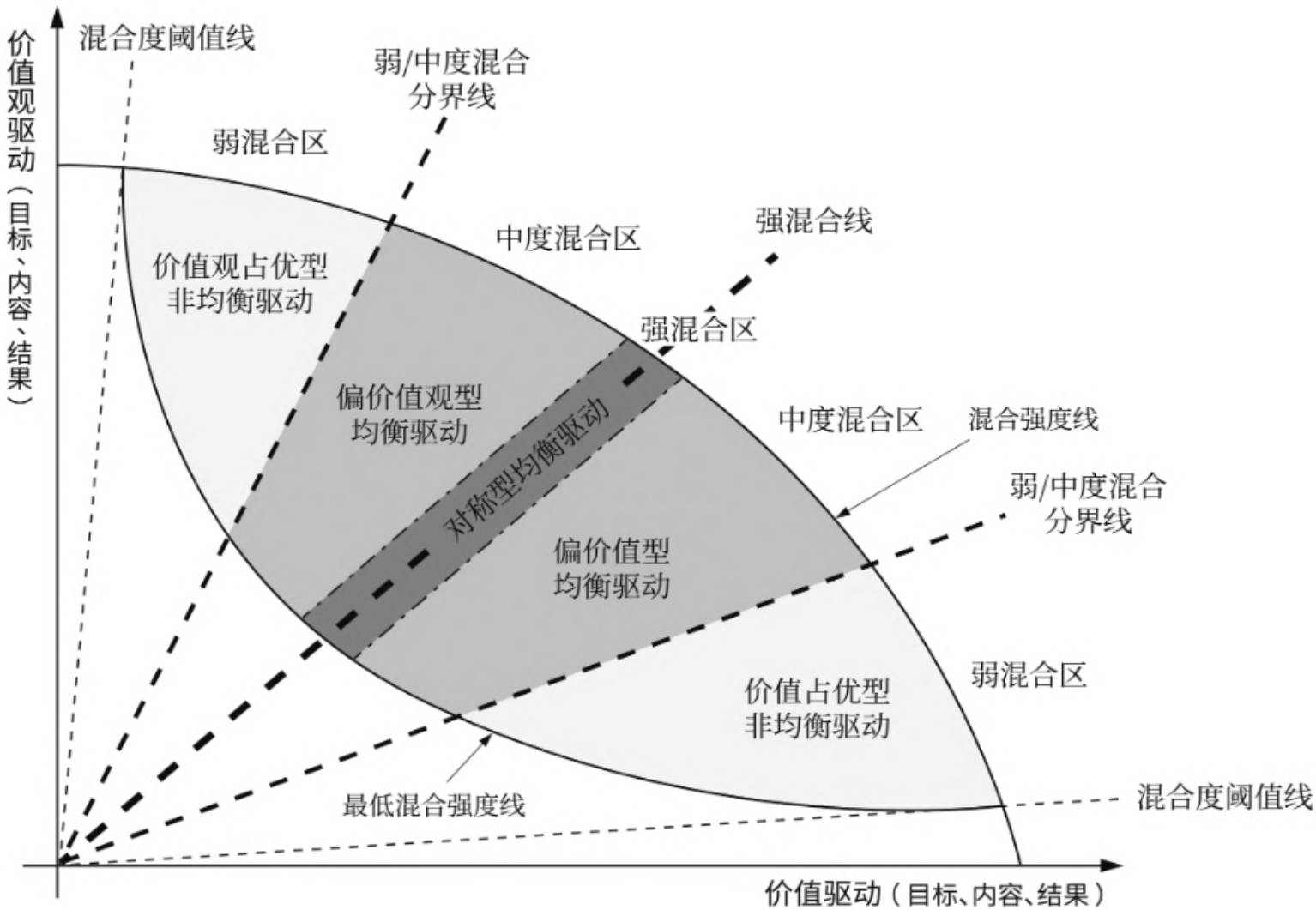 ESG原动力并非要么混合、要么不混合,而是类似于组织的混合度具有变化性,其依据价值与价值观的混合水平表现出差异化的混合度。价值与价值观的混合度可由企业践行ESG的目标、内容和结果混合程度综合衡量。由于价值与价值观的混合是多元素的组合,因此ESG原动力不是单一维度下的线性光谱,也非线性韦恩图,而是处于价值与价值观混合的一定范围区域,这一区域的边界可以依据混合度差异予以确定。具体而言,ESG原动力要求价值与价值观的混合度应高于某一阈值,否则就会因任何企业行为都有不同程度的动机混合特征而带来ESG原动力的“泛化”。除需满足一定的混合度阈值外,ESG原动力还应在价值与价值观的叠加浓度上满足底线要求,即混合强度应超过最低强度要求。以价值驱动和价值观驱动为两轴,结合价值与价值观的混合度阈值、混合强度曲线和最低混合强度线,就可以确定ESG原动力的范围区间,如图1所示。更进一步,在阈值之上,价值与价值观的混合度可以区分为强混合、中度混合和弱混合三个等级,由此ESG原动力的范围区间可划分为两个弱混合区、两个中度混合区和一个强混合区,如图1所示。