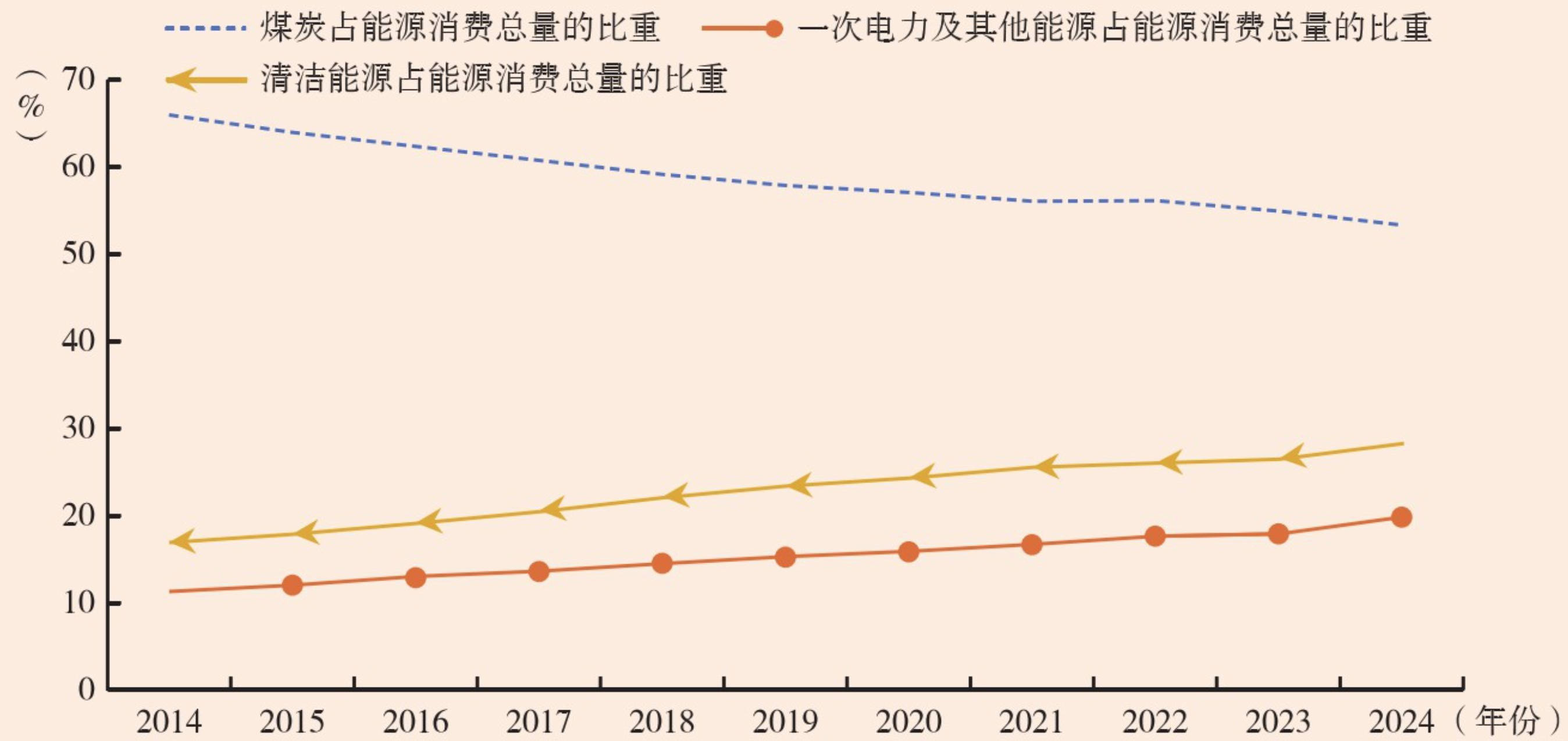 的比重稳定下降,分别从73.5%、8.3%下降至63.9%、6.1%;天然气、一次电力及其他能源的占比持续提高,从18.2%增长至30%;煤电机组改造升级持续推进,2024年,煤电机组淘汰产能超800万千瓦,改造升级1.8亿千瓦;清洁能源发电占比不断提高,规模以上工业水电、核电、太阳能发电和风电占比已提高至32.6%,全国已建成投运新型储能项目累计装机1.68亿千瓦时。能源供给智能化水平稳定提高,供给体系更加高效。如智能化煤炭产能比重已经超过五成,大中型煤矿原煤生产综合能耗已下降至2023年的9千克标煤/吨,发电机电站供热总效率从2014年的43.5%增长至2022年的47.9%(袁惊柱,2025)。