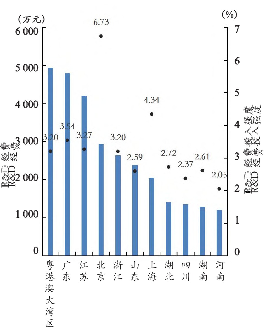 图1 粤港澳大湾区R&D经费及投入强度与全国前10省(区、市)对比