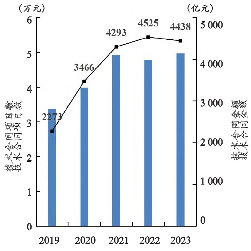 图3 2019—2023年广东省各类技术合同项目数和合同成交额