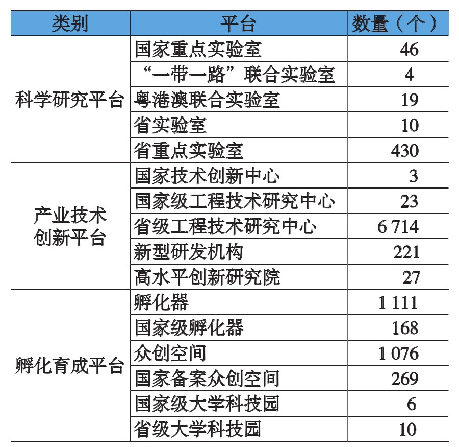 基础研究体系不断完善。科研平台的发展成效尤为显著,成效尤为显著,大湾区共计拥有46家国家重点大湾区共计拥有实验室、4家“一带一路”联合实验室、19家粤港澳联合实验室等高水平科研机构。建立3家国家技术创新中心和27家高水平创新研究院,推动科技创新与产业深度融合,为大湾区的产业升级和转型提供了有力支撑。在孵化育成平台建设上,大湾区累计建成国家大学科技园6个、省级大学科技园10个,为大湾区的初创企业和创新团队提供了优质的创新创业环境;建成111个企业孵化器、1 076个众创空间等孵化平台,其中不乏国家级孵化器和国家备案众创空间,为大湾创空间,为大湾区的创新创业生态提供了有力保障(表4)。